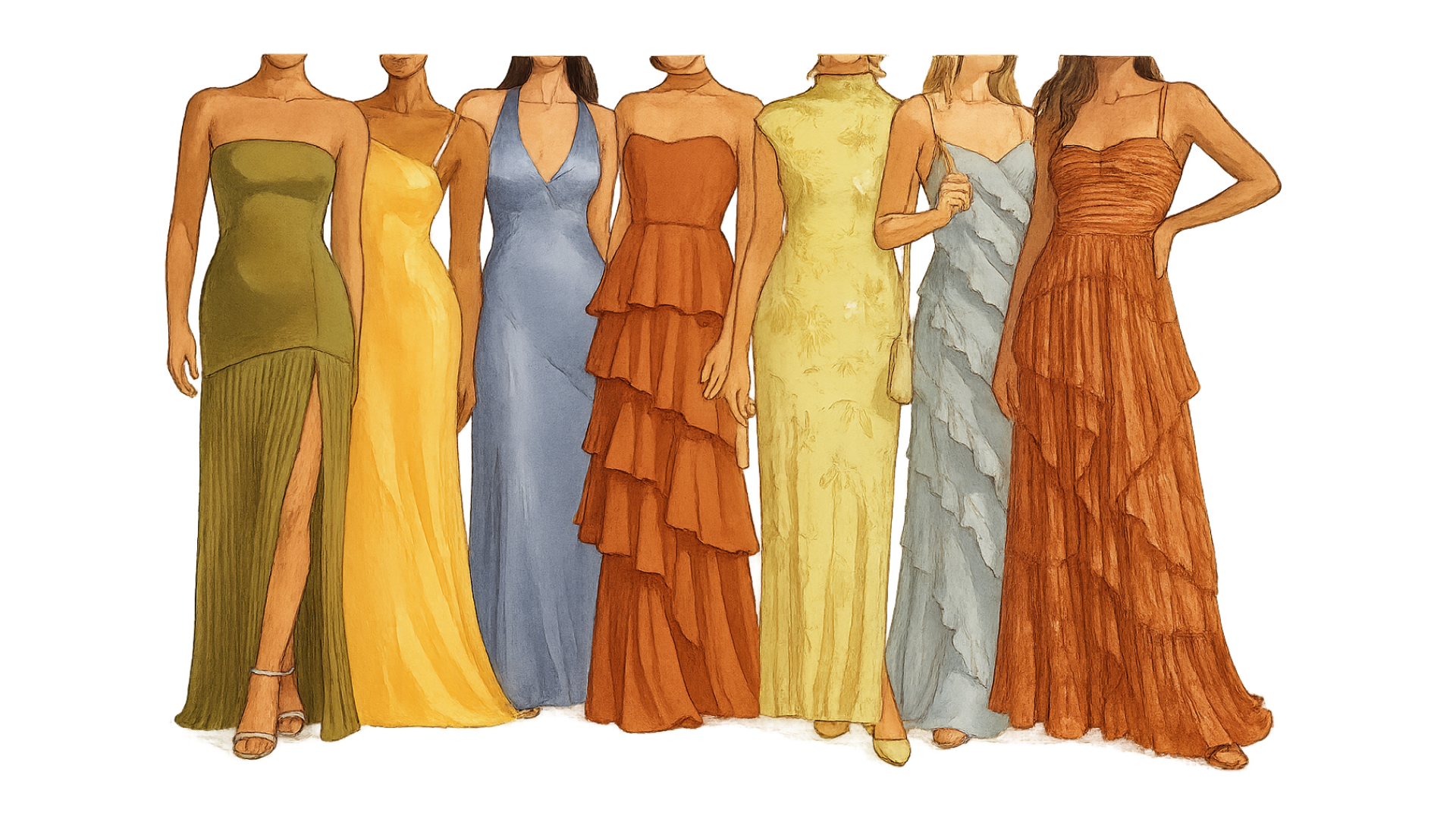 Flow in long dresses in silhouettes, silk, chiffon, or lace, paired with strappy sandals or heeled mules.